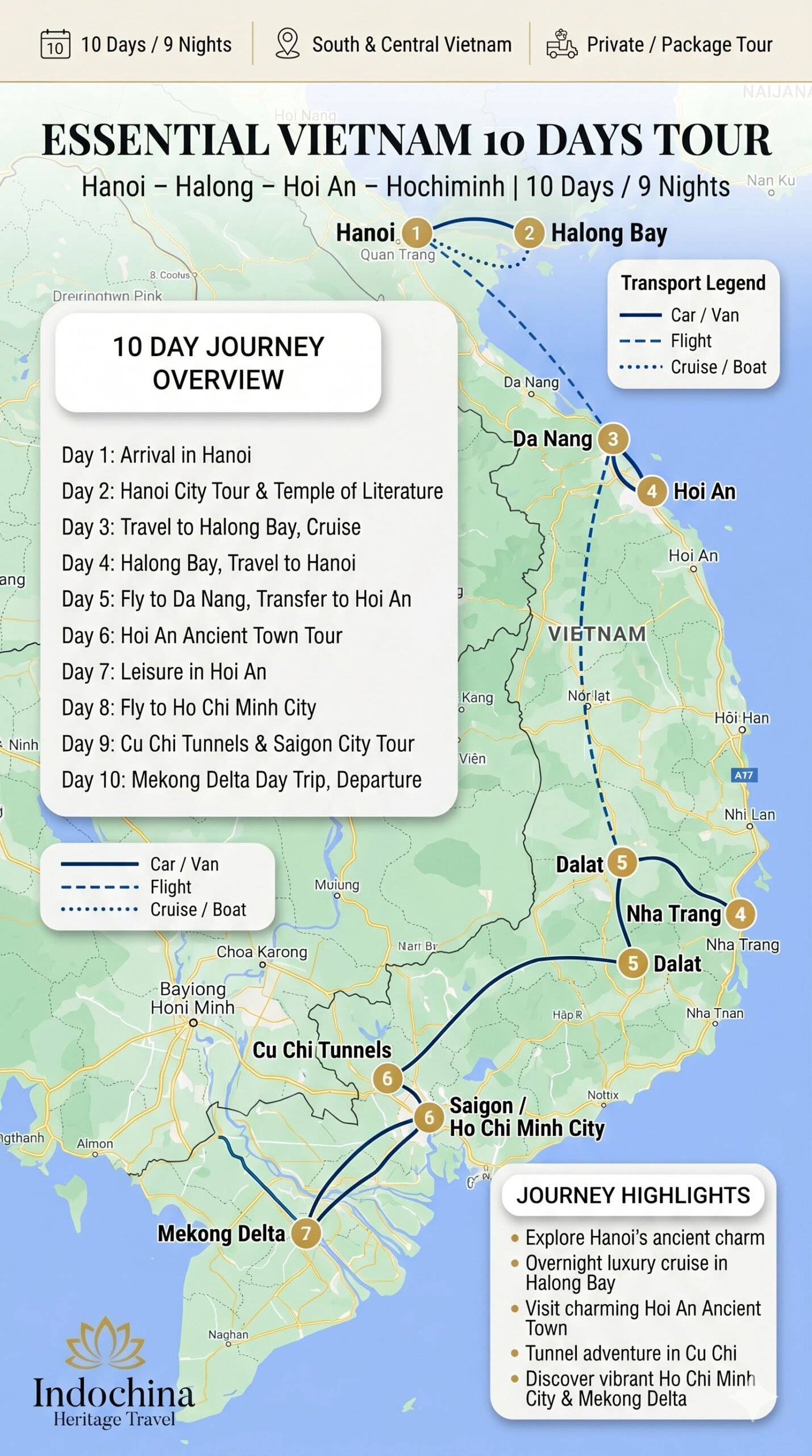 This 10-day Essential Vietnam Tour is a carefully designed North-to-South journey covering the country’s most iconic highlights. From elegant Hanoi and the dramatic landscapes of Halong Bay to the timeless charm of Hoi An and the energy of Ho Chi Minh City, the itinerary balances culture, scenery and authentic local experiences.