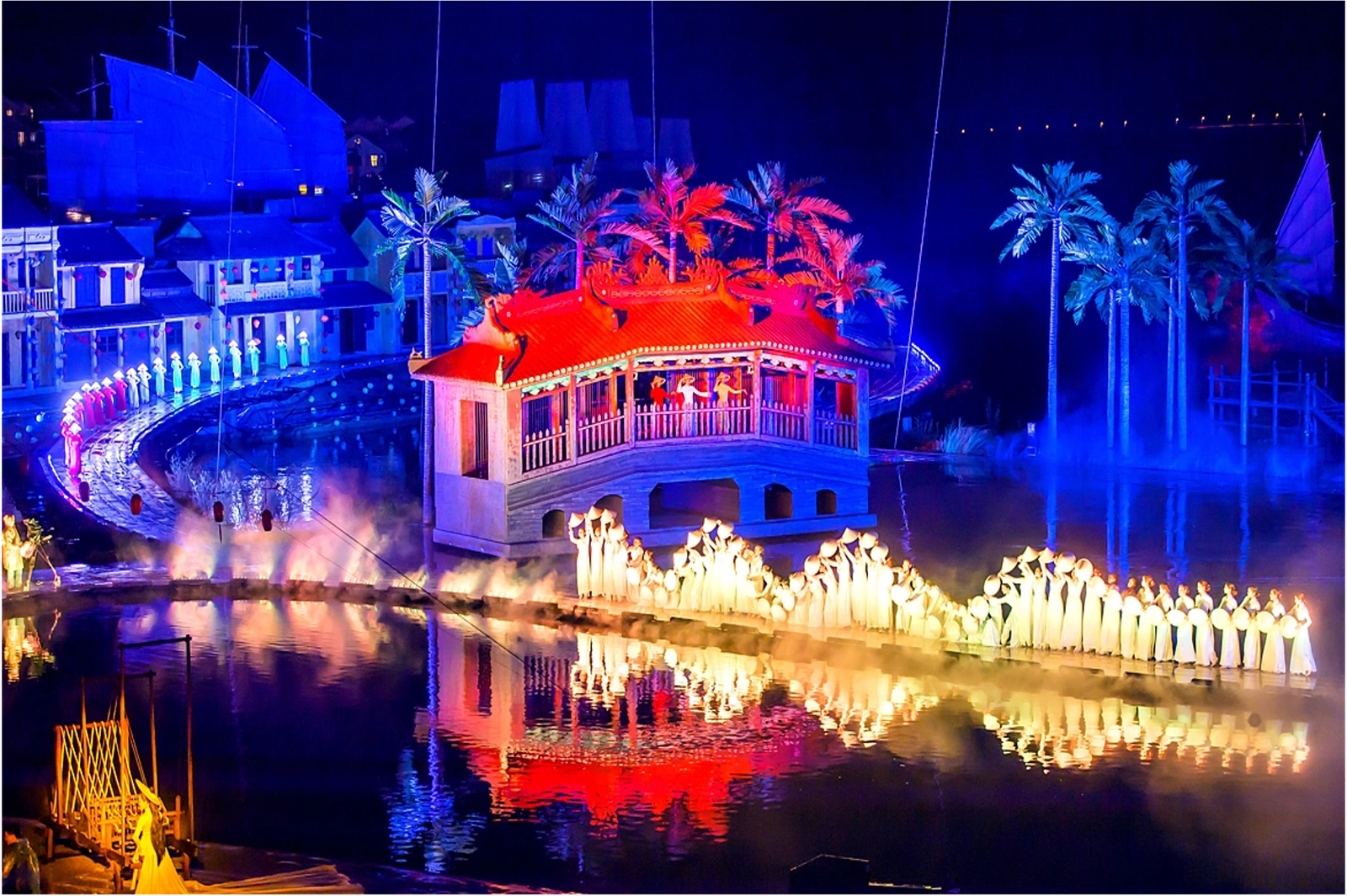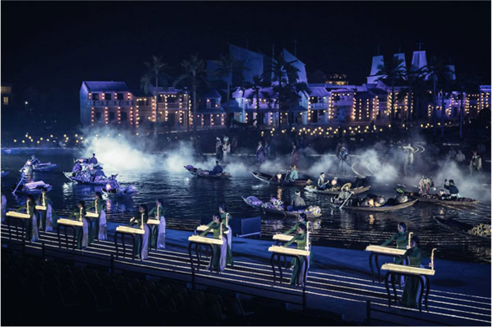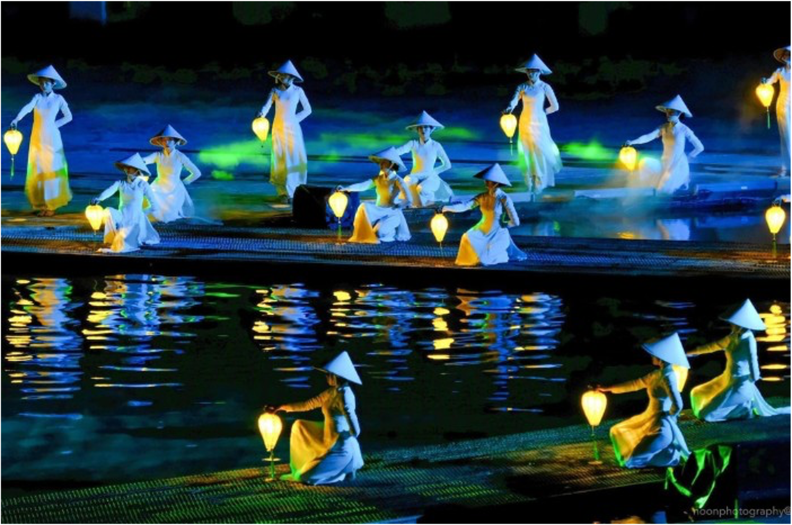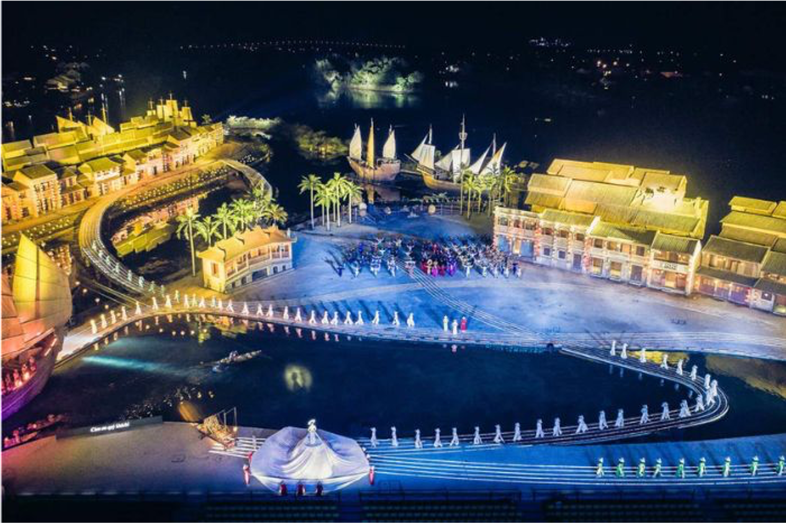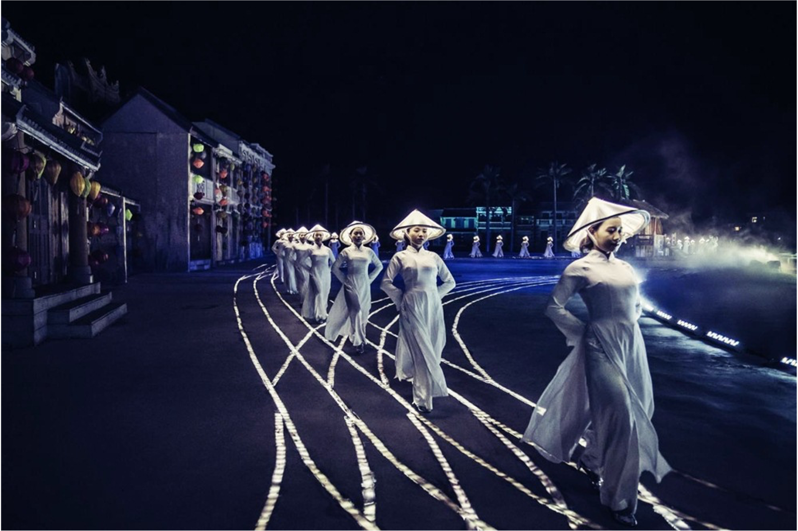 The set boasts massive movable props allowing the drama to evolve and develop along with the city. Lights also play a huge role with fleets of illuminated bicycles and conical hats, along with lengths of light rails built into the ground. This is the largest scale production of all the Hoi An cultural shows.